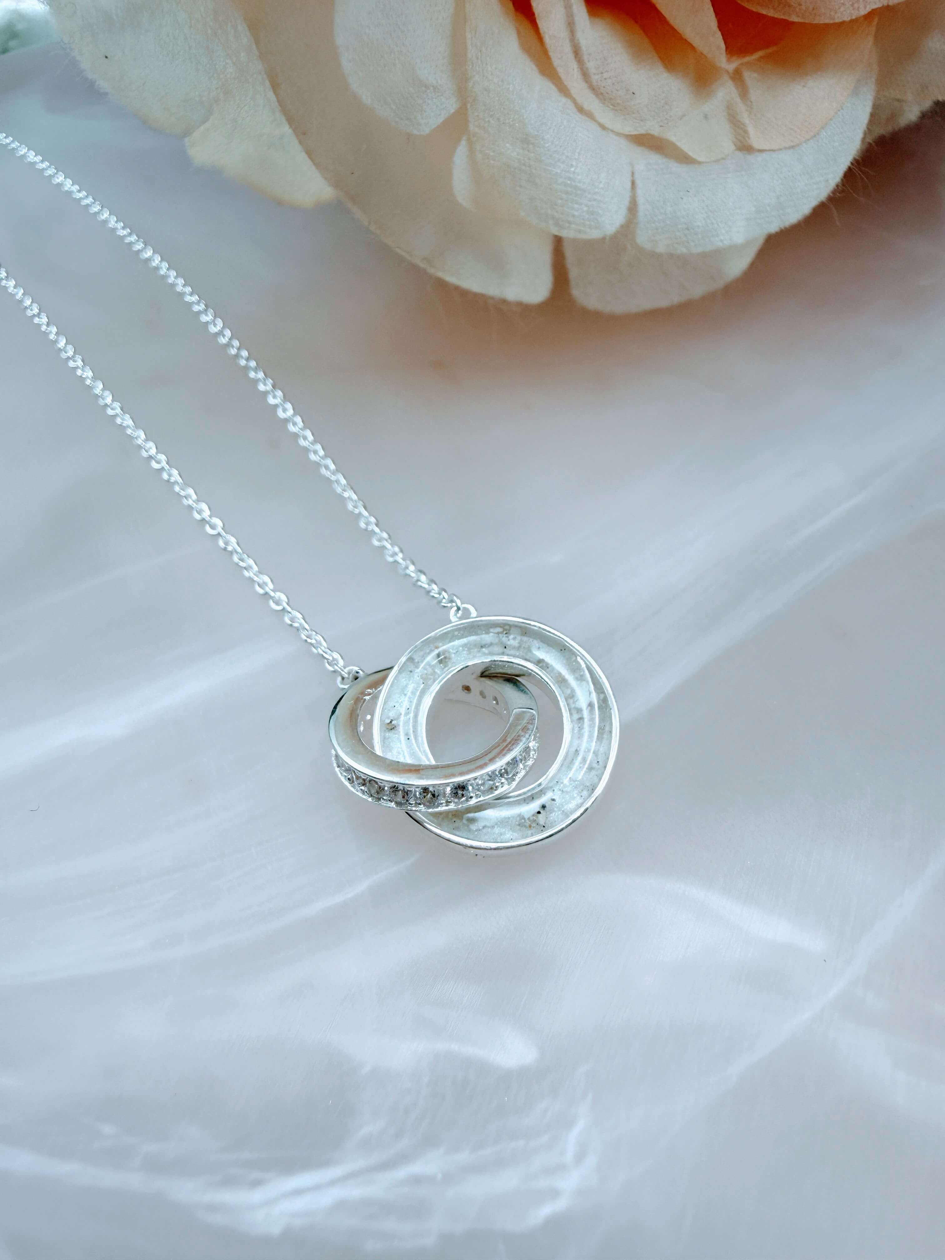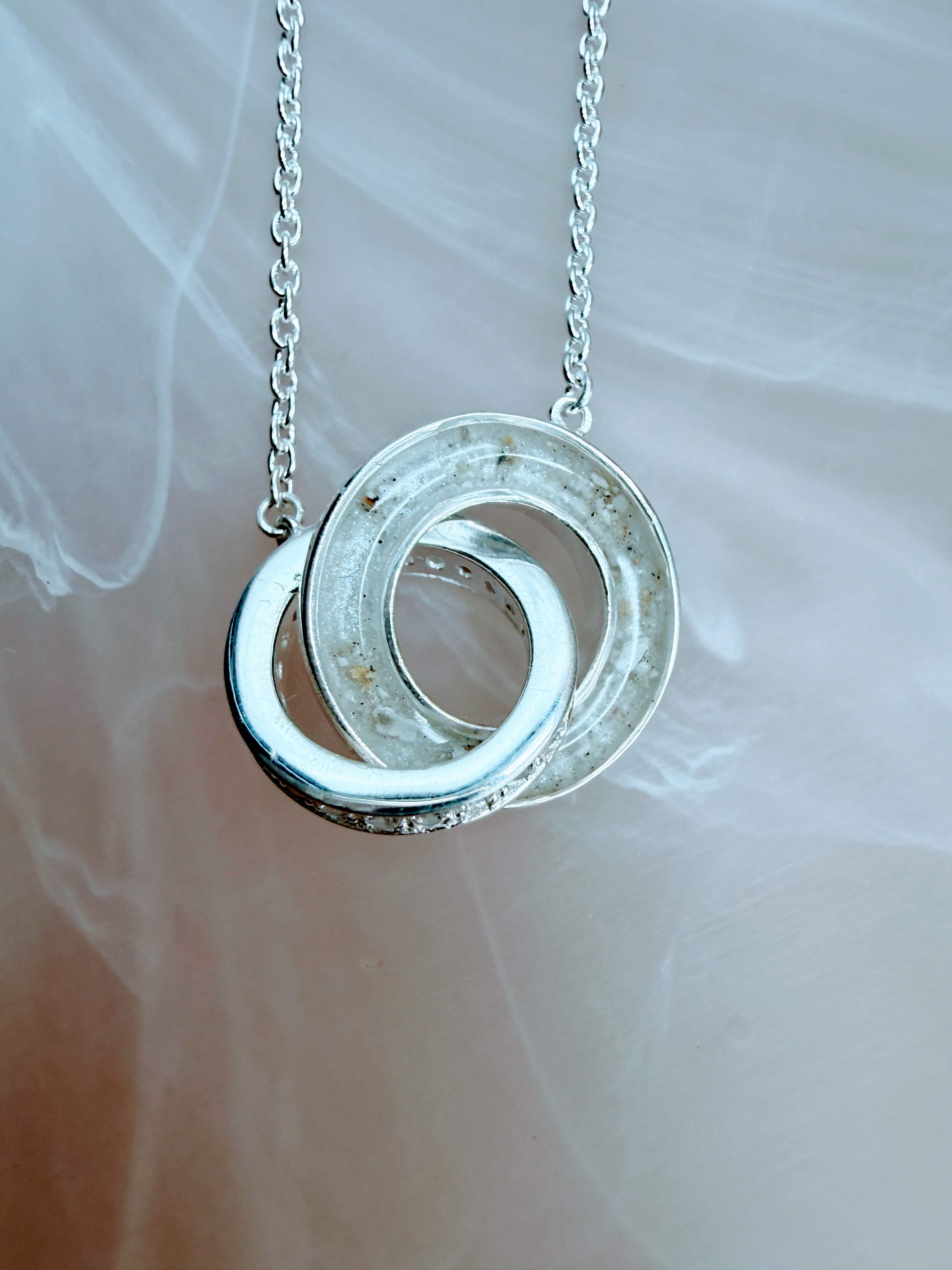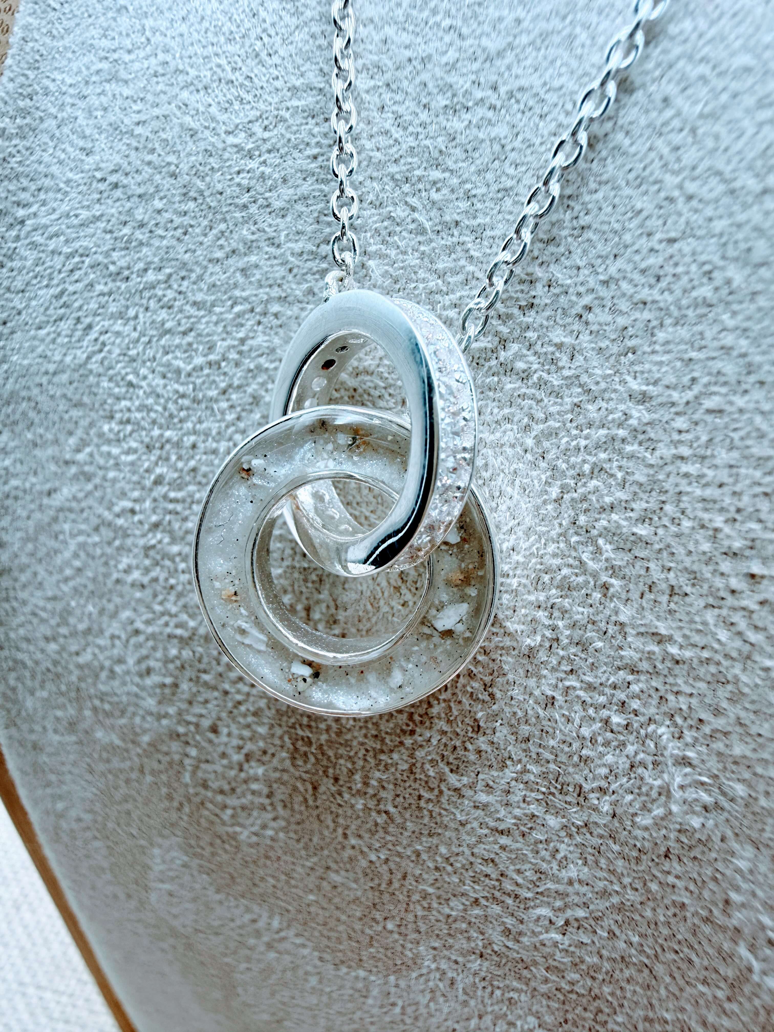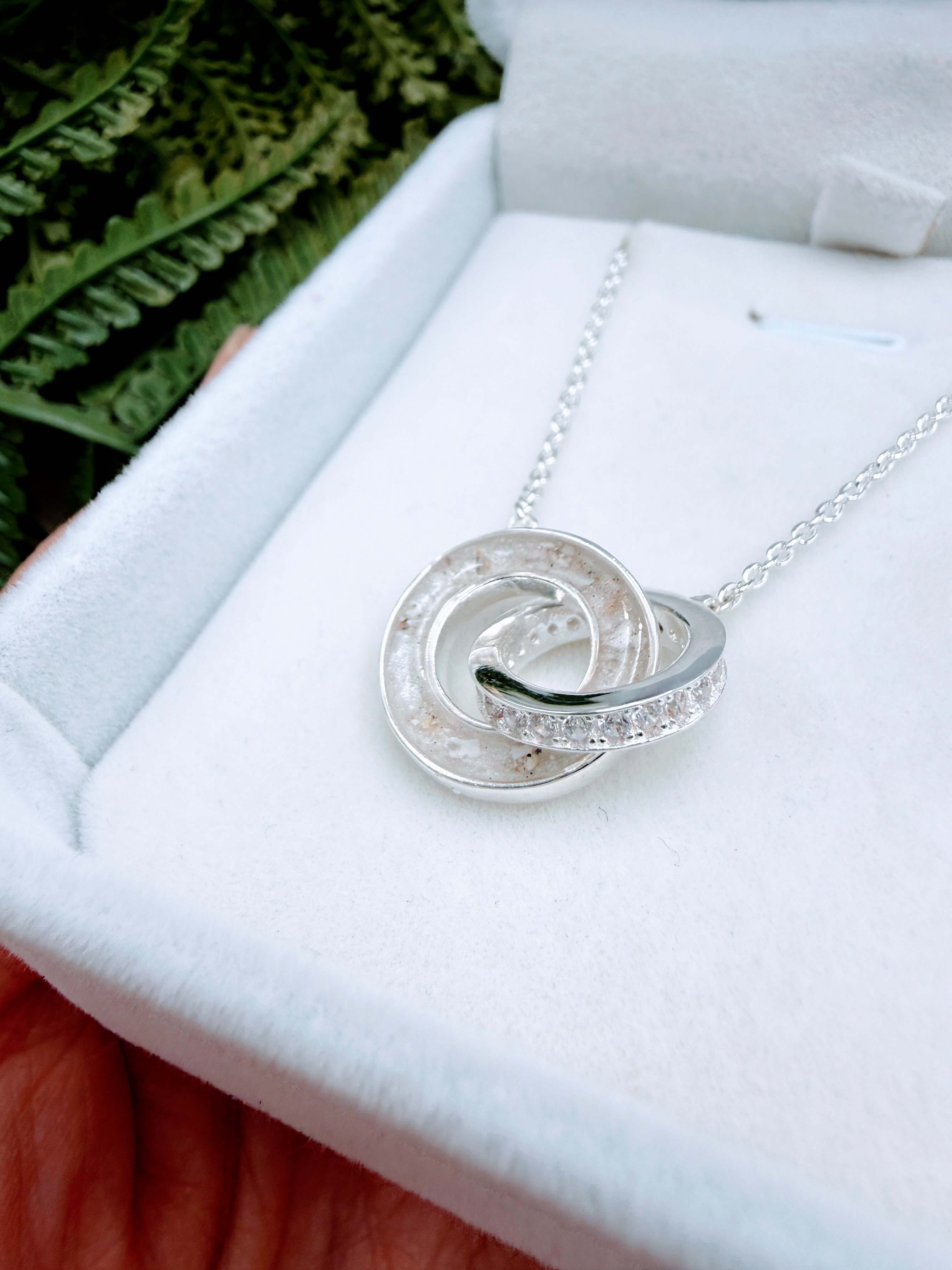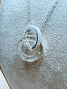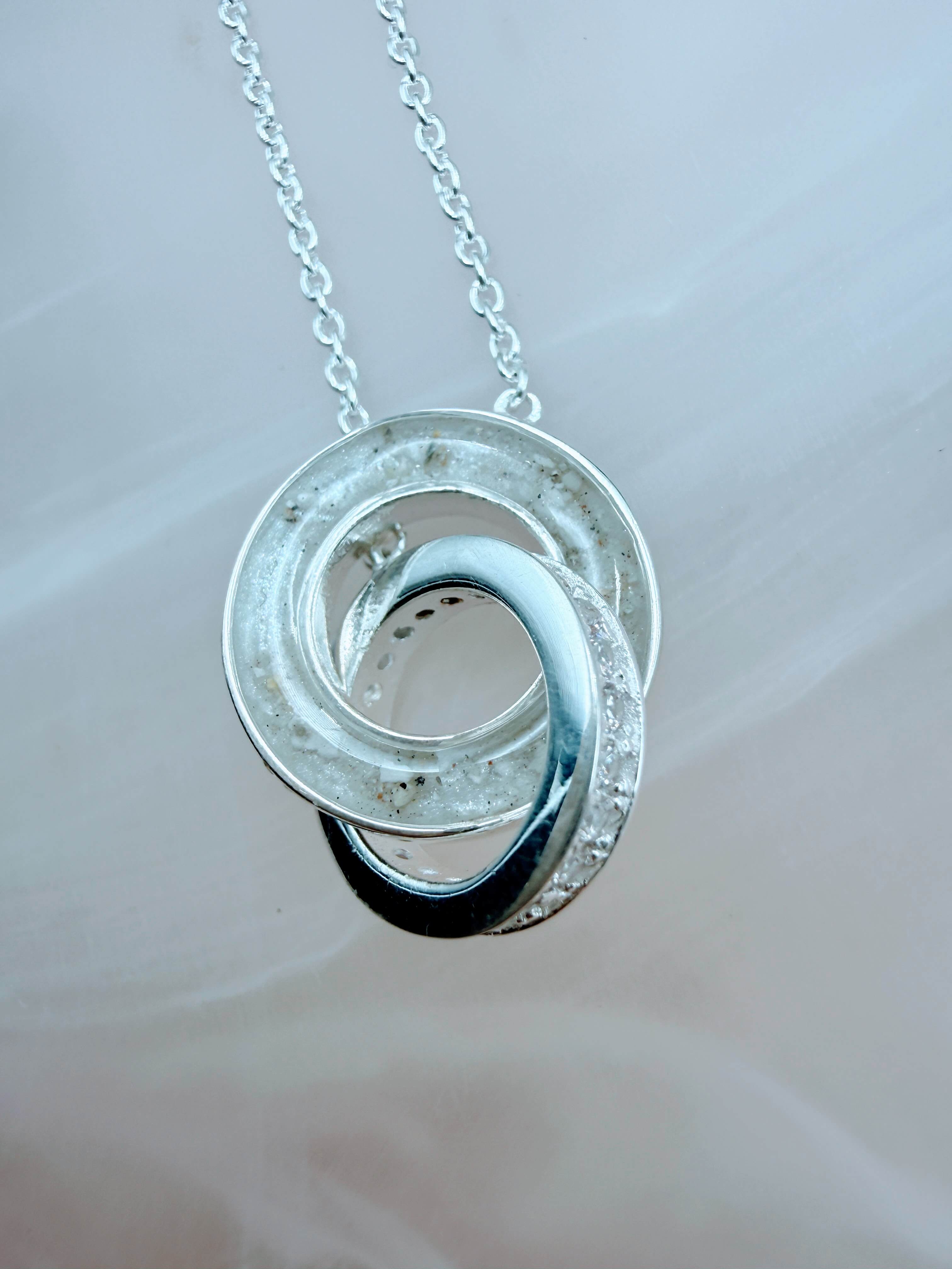 This is our Entwined Pendant, available in sterling silver. One of the round discs is custom made to hold breast milk or any inclusion you choose. Shown here with breast milk and a delicate sprinkle of ashes.
