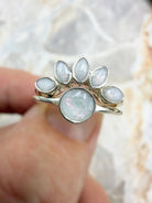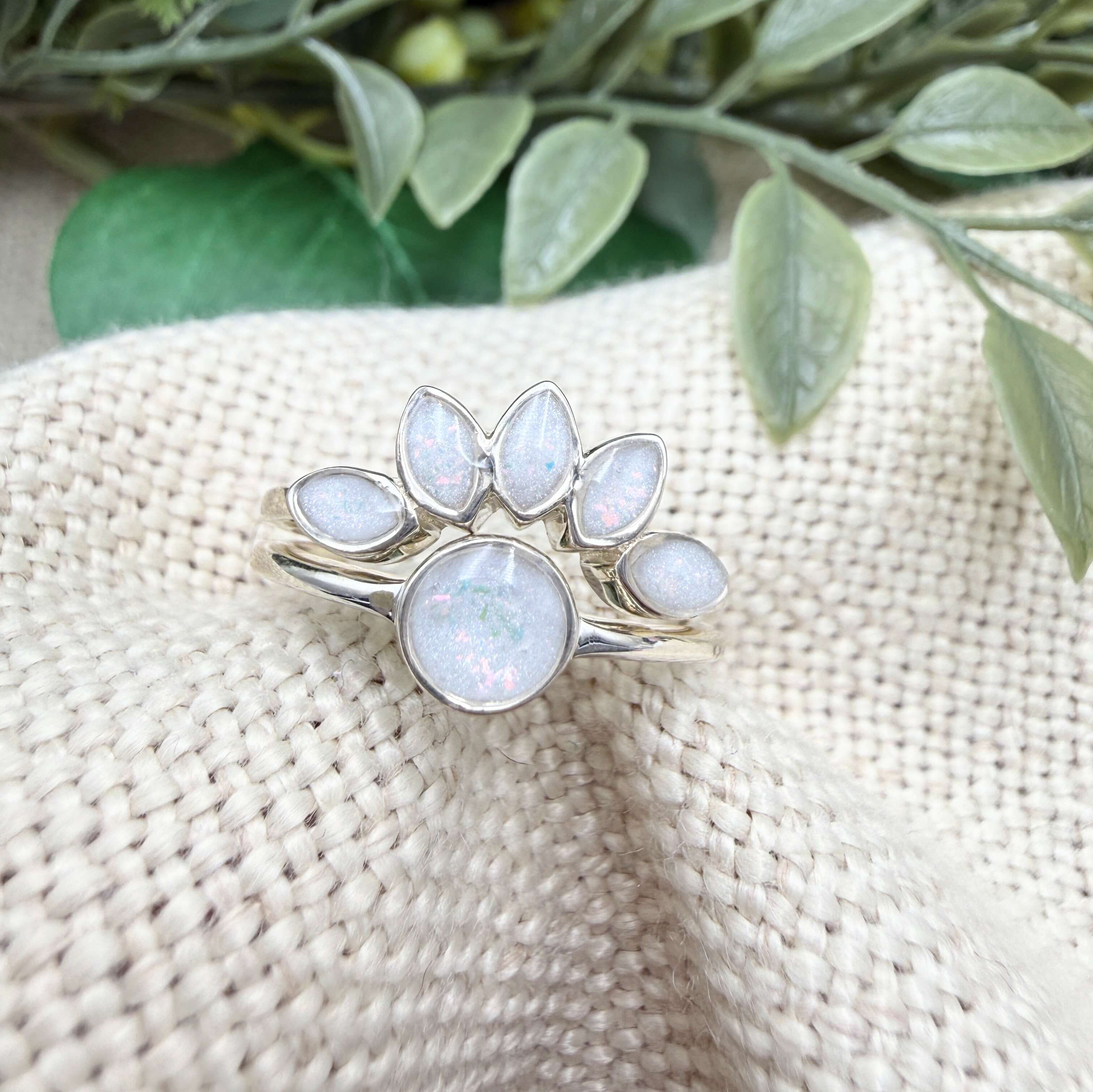 Inspired by moonlight and blooming petals, this stacker set features a central round breastmilk stone paired with softly curved marquise 'petals'. Each setting reflects the quiet strength, tenderness, and transformation that motherhood brings.