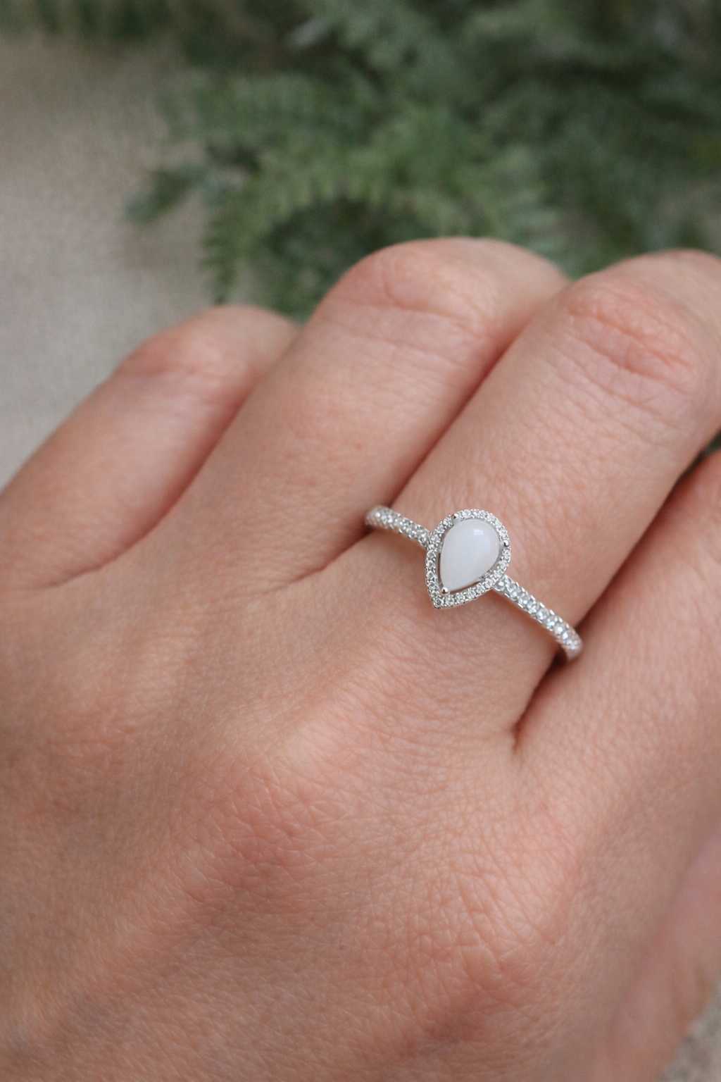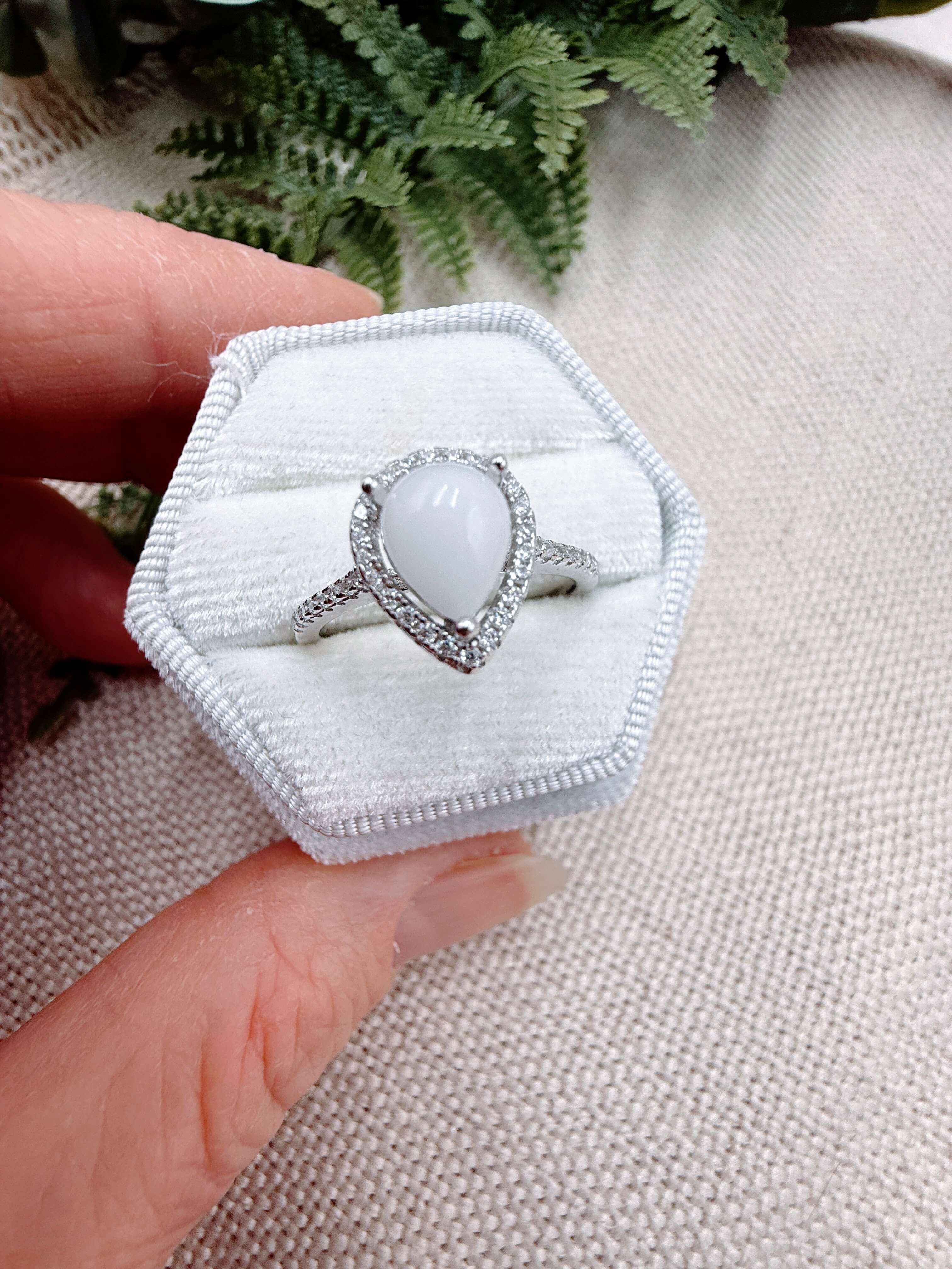 This delicate ring features an 8 x 6 mm breast milk stone, carefully set in sterling silver and finished with your choice of white gold or rose gold plating.