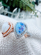 The centre stone is framed by a halo of clear cubic zirconia, which continue gently along the band, adding a soft sparkle while keeping the design beautifully refined.
