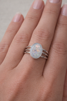 The Triple Stacker Oval ring features an 8 × 10 mm oval stone set across three fine bands, creating a balanced, everyday piece that feels both delicate and grounding.