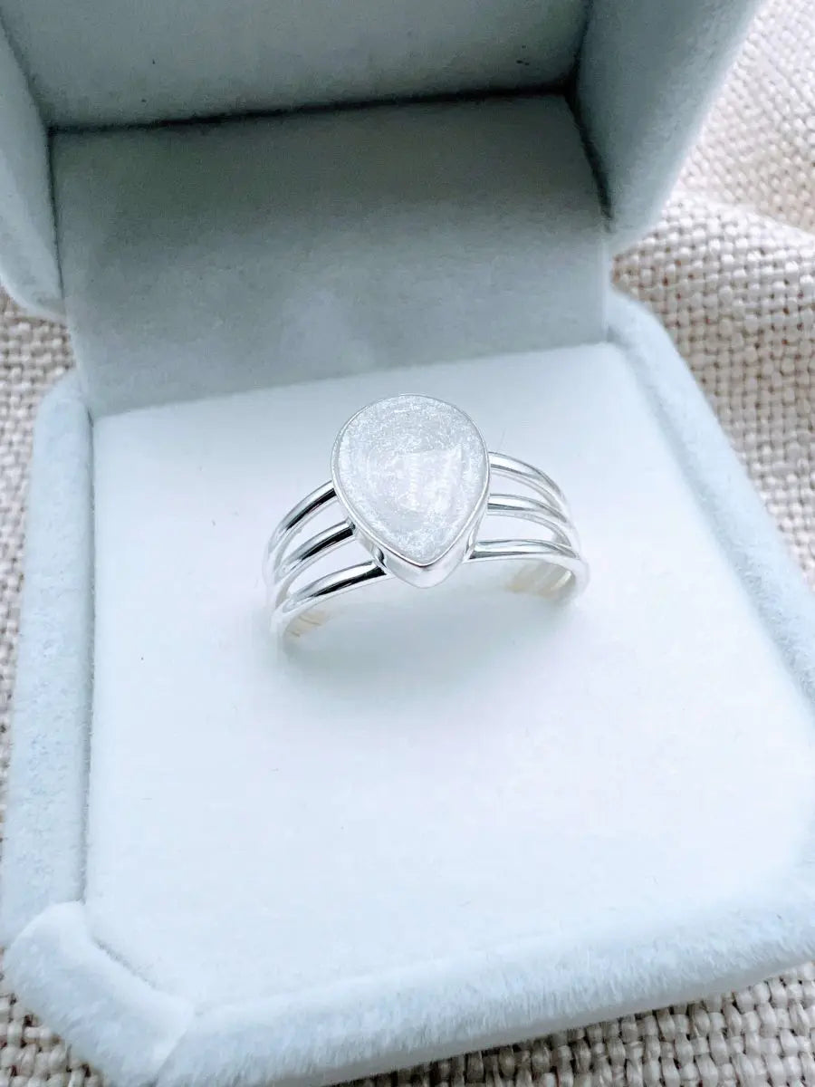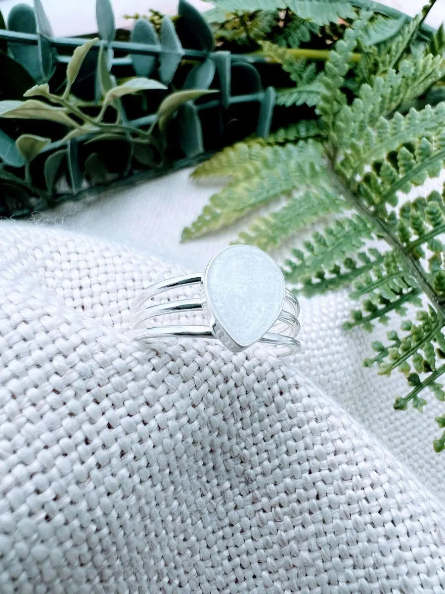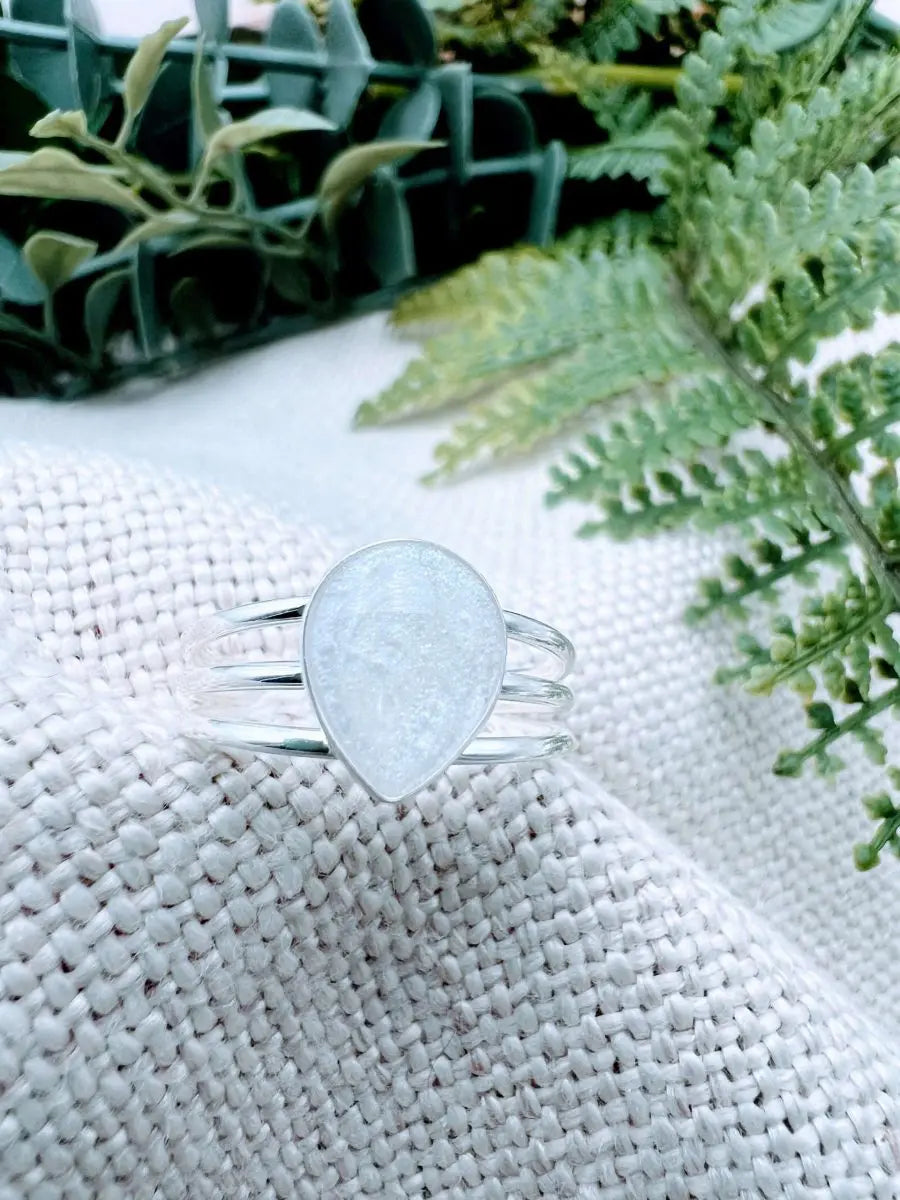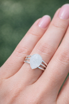 This design features a soft pear-shaped centre stone measuring 7 x 9 mm, set across three fine sterling silver bands that sit comfortably together on the finger. The triple band style gives the piece a sense of presence while still feeling delicate and wearable every day.