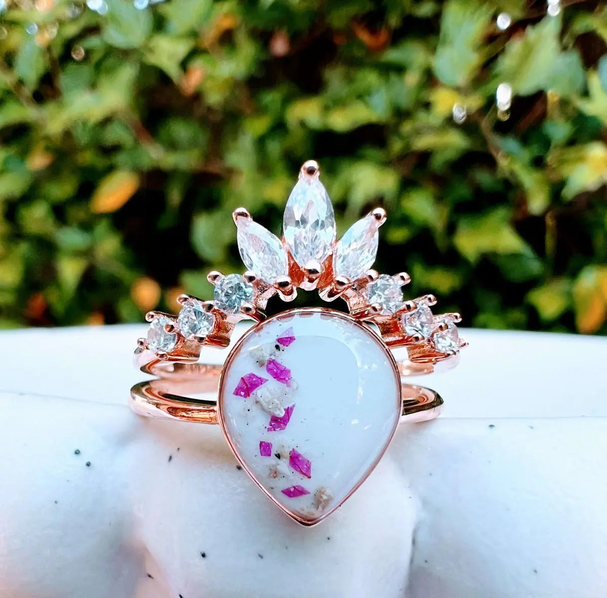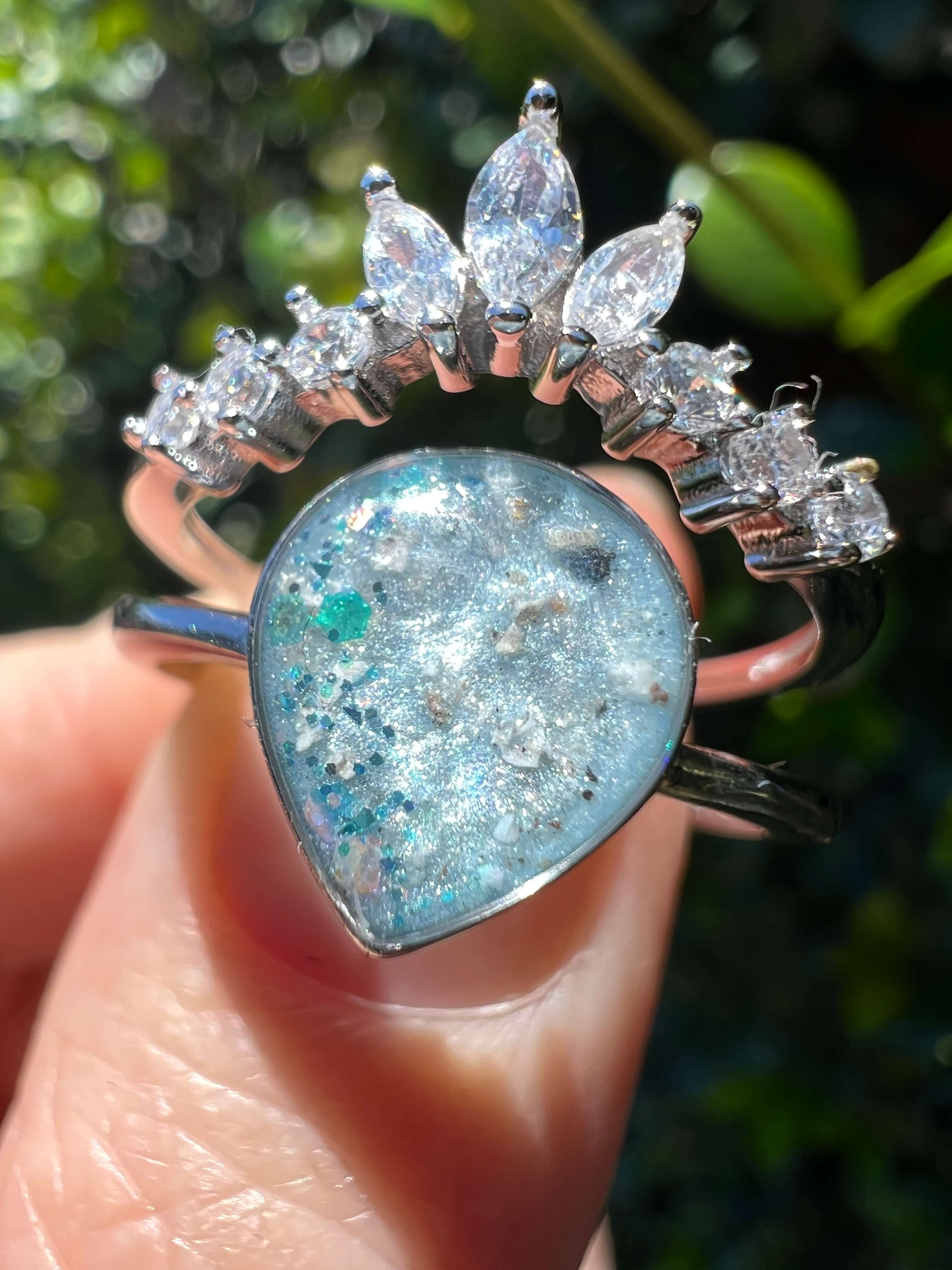This willow stacker is designed to feel both meaningful and a little bit magical. At its centre sits a teardrop-shaped setting at 8 x 10mm, perfect to hold breast milk or any inclusion that tells your story. Above it, a delicate tiara of sparkling stones fans out gently, adding light, balance and a sense of celebration without overpowering the piece.