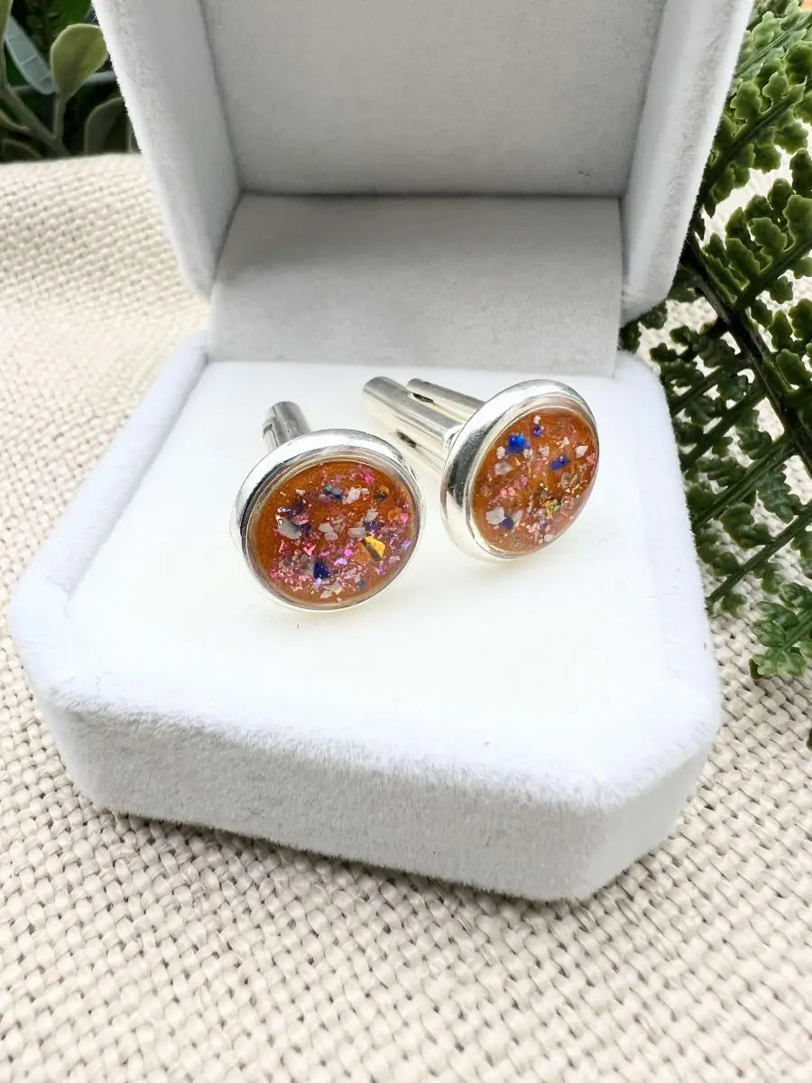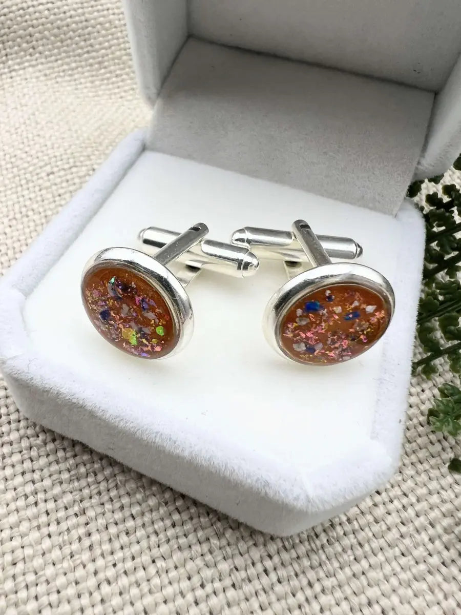These stunning sterling silver cufflinks can be crafted from hair, ashes, dried wedding or funeral flowers, fabric or breastmilk. Shown here with ashes, one with colour added and one without.
