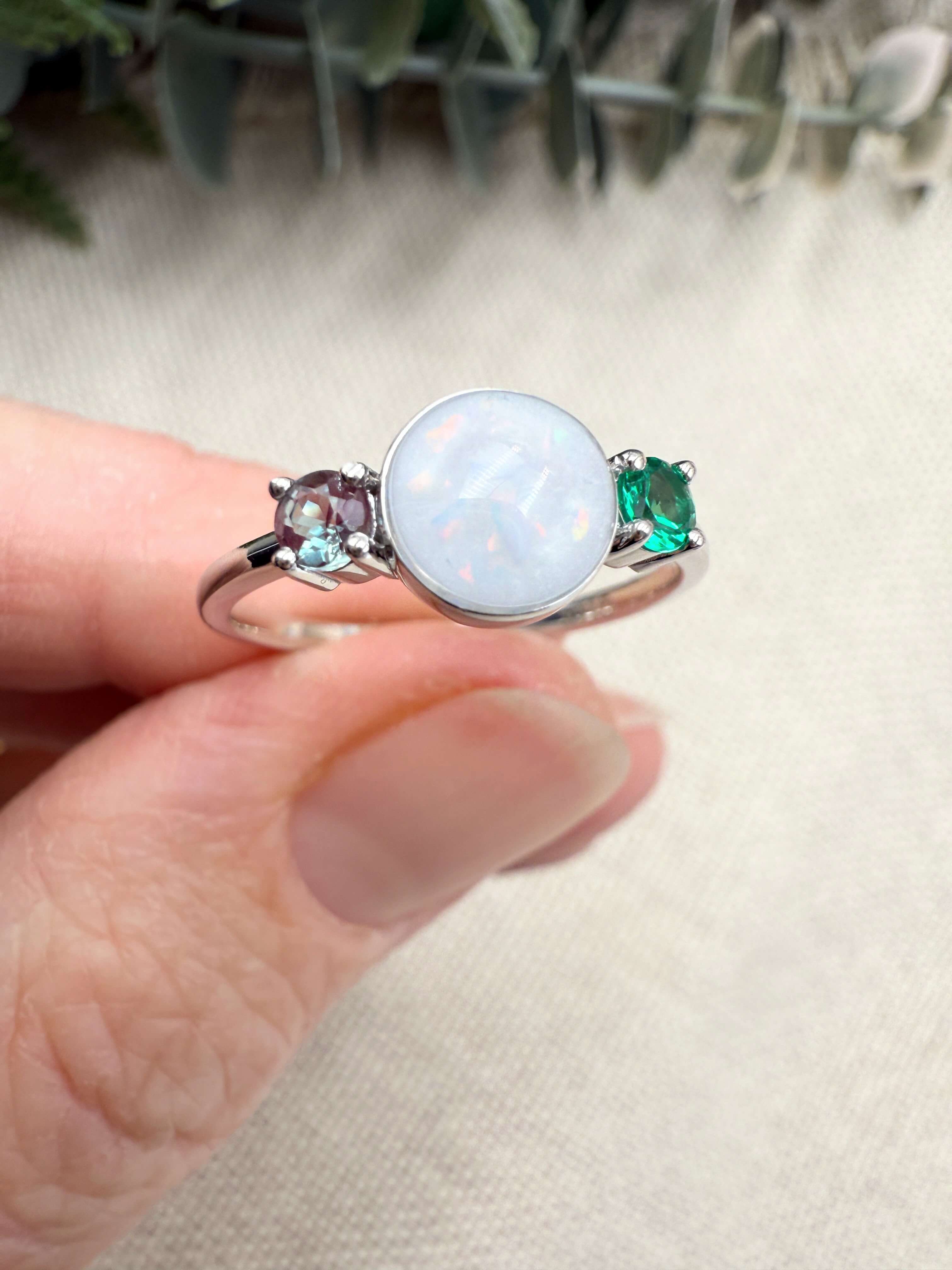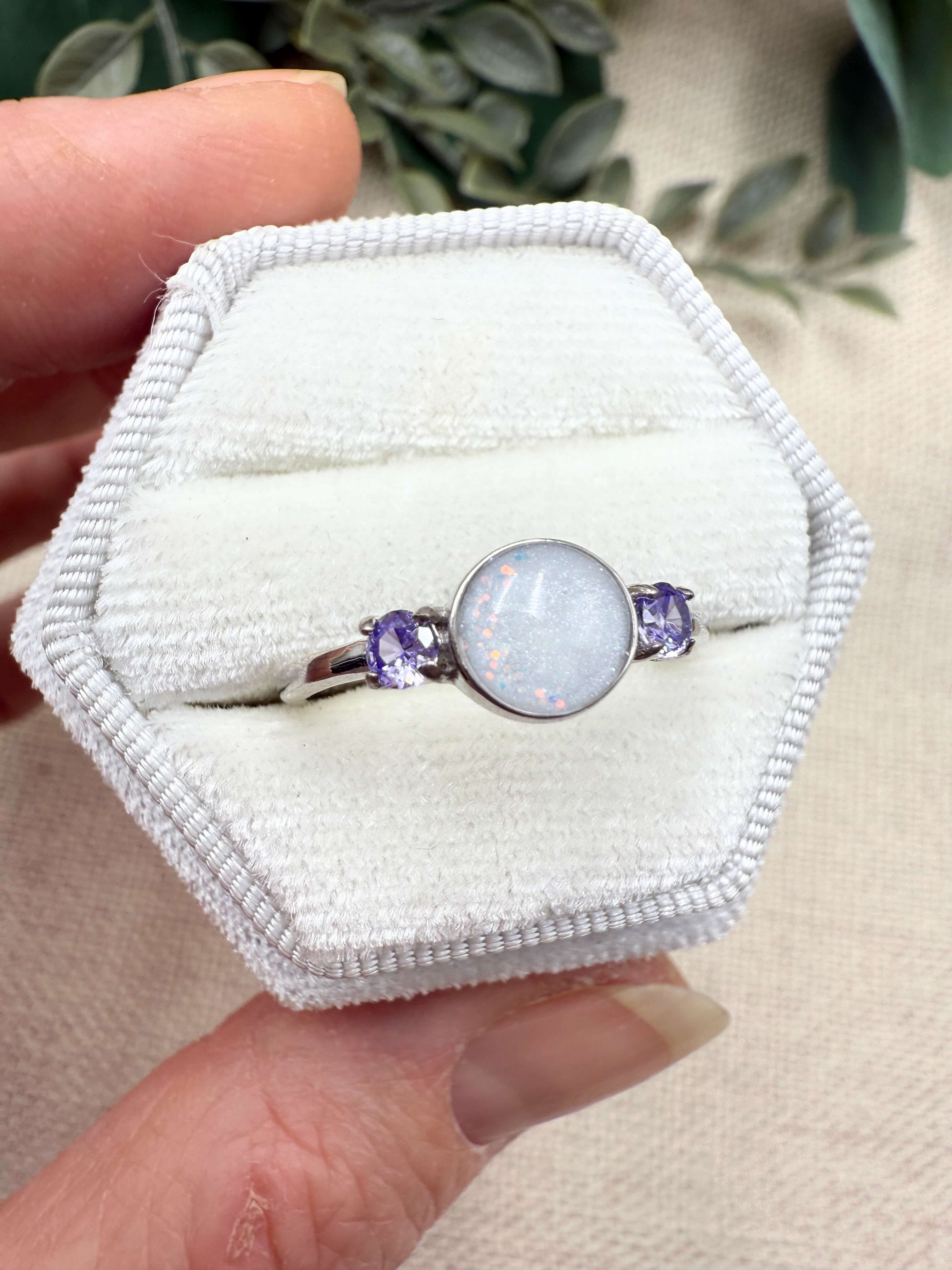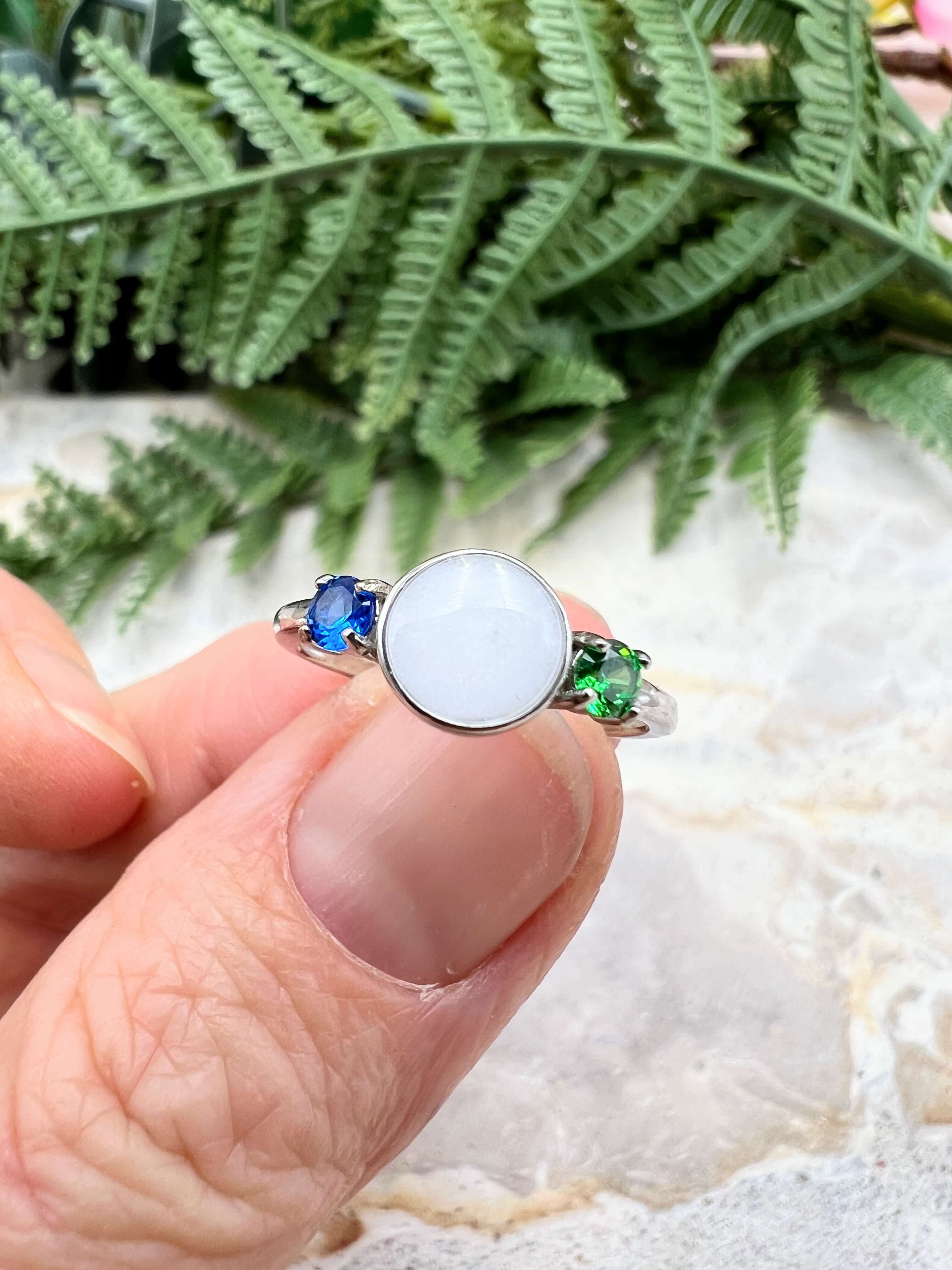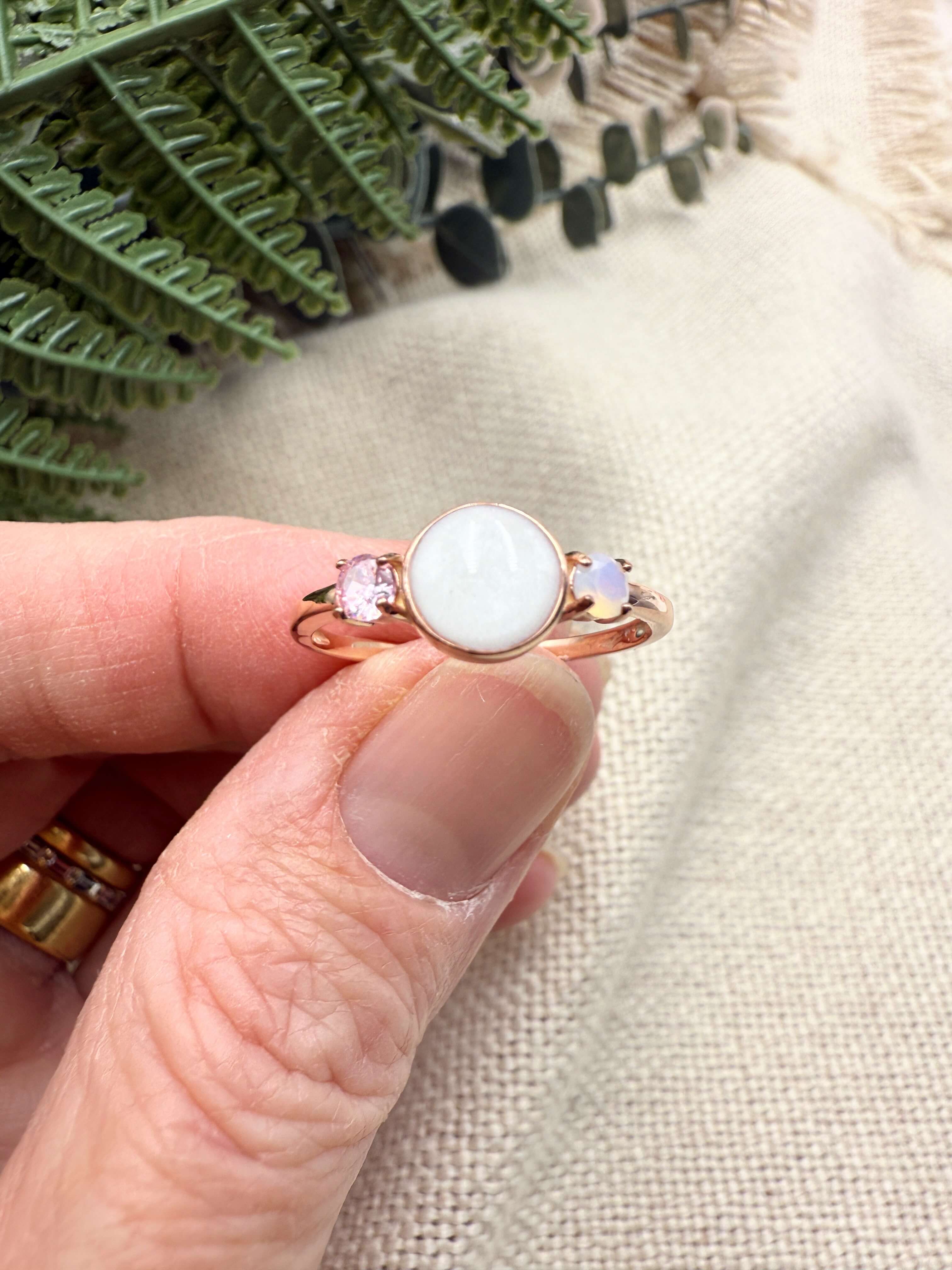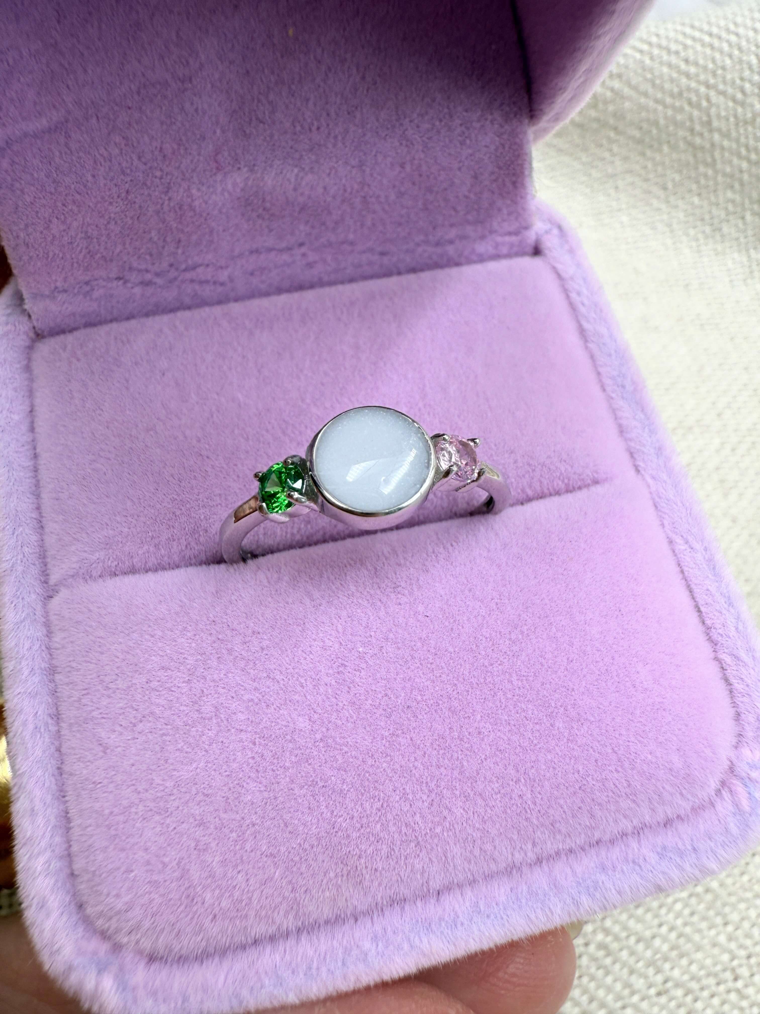 This is a stunning sterling silver ring with an 8mm breastmilk stone and two smaller cubic zirconia in the colour of your choice. Available in sterling silver with white, rose or yellow gold plating. Please add your stone colour choices and any other preferences in the comments box below.
