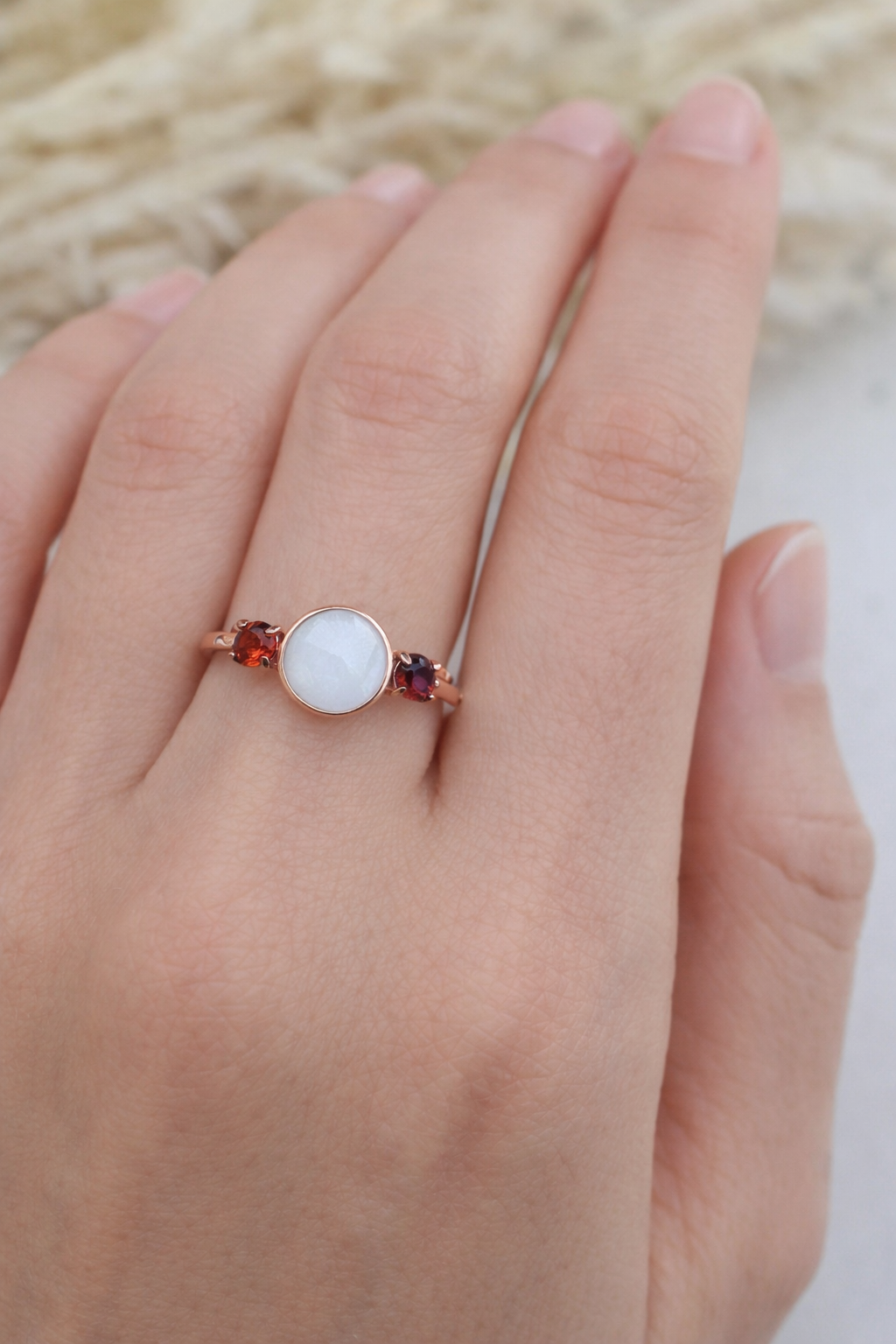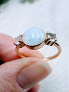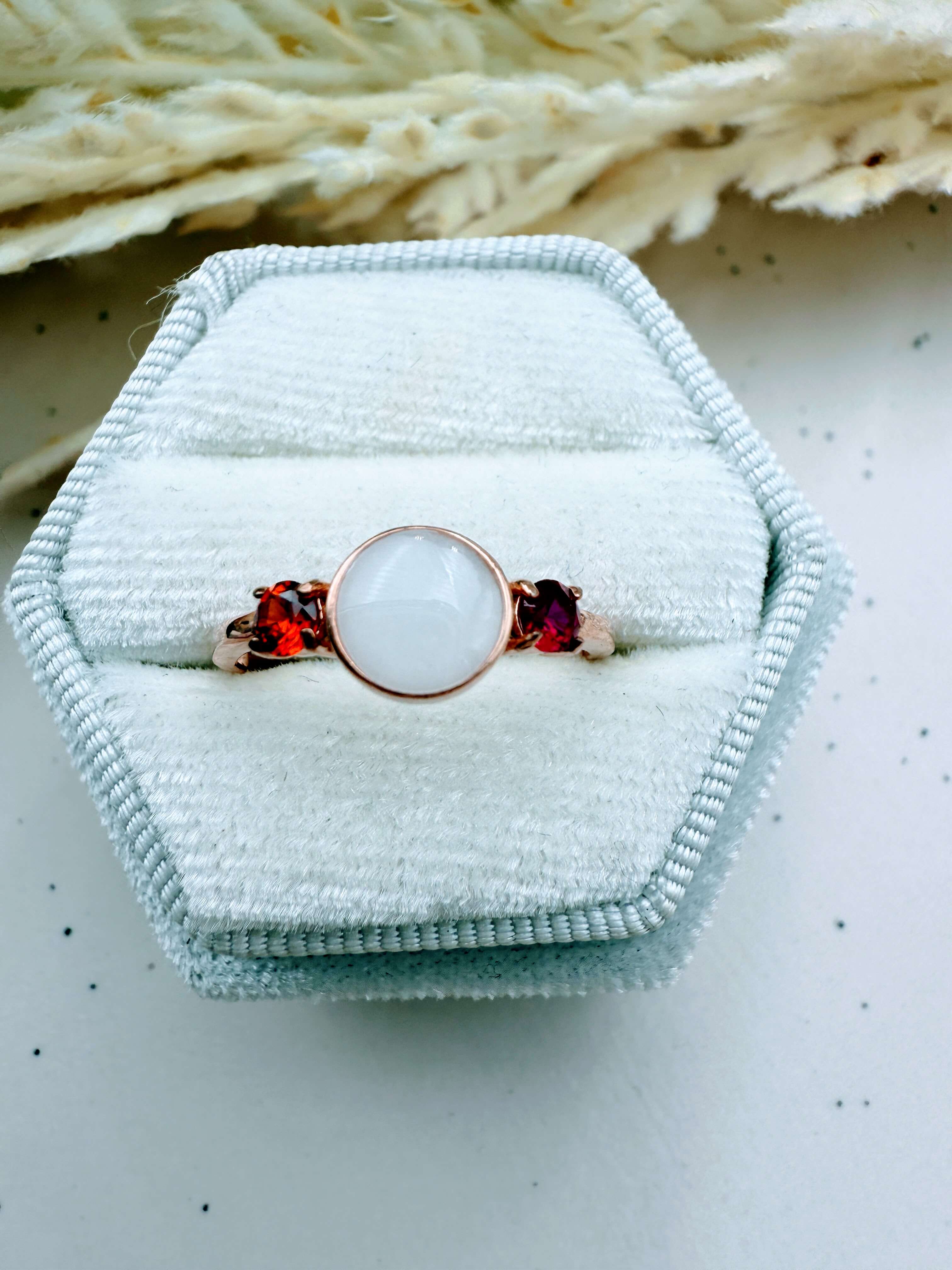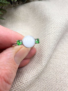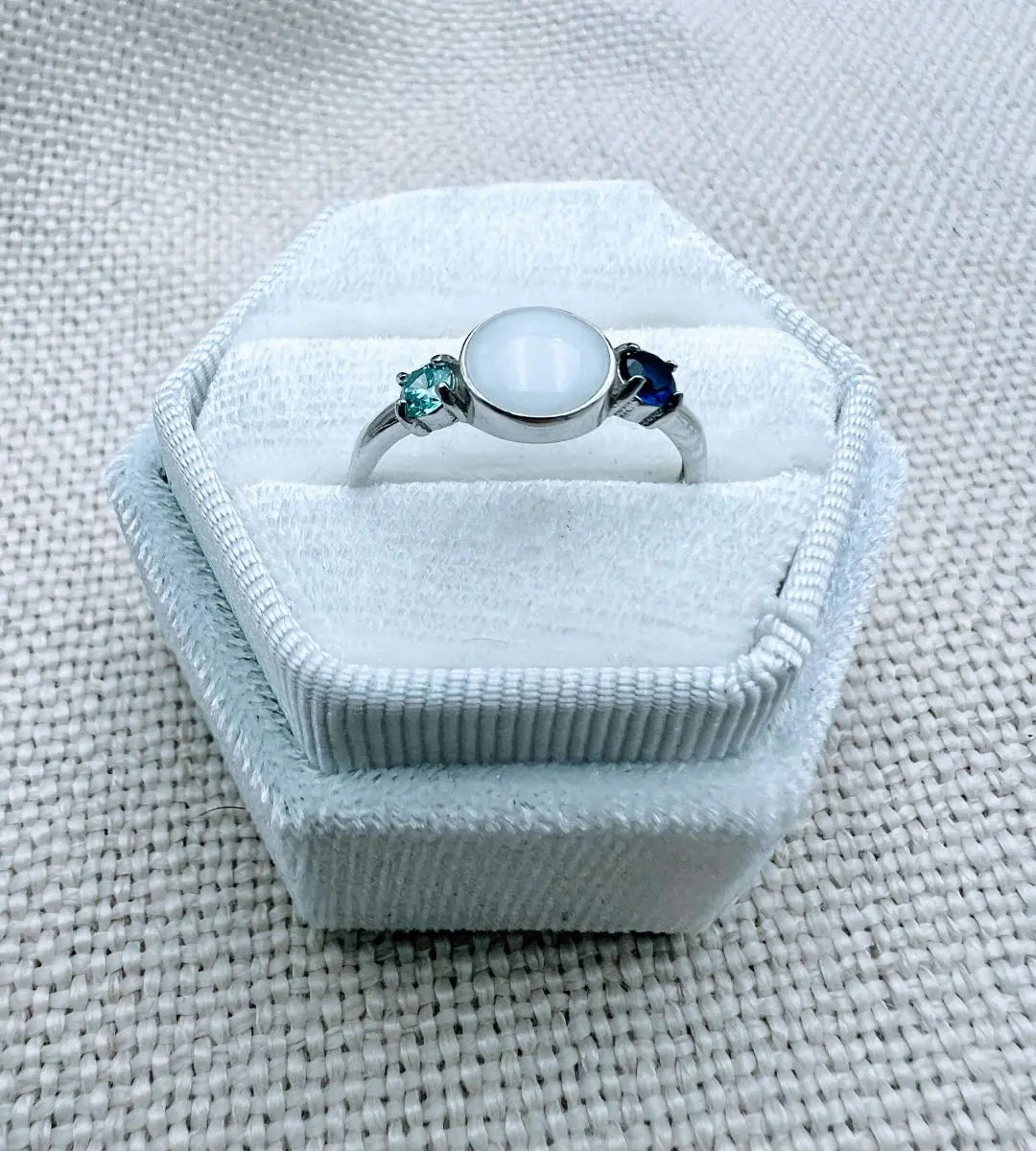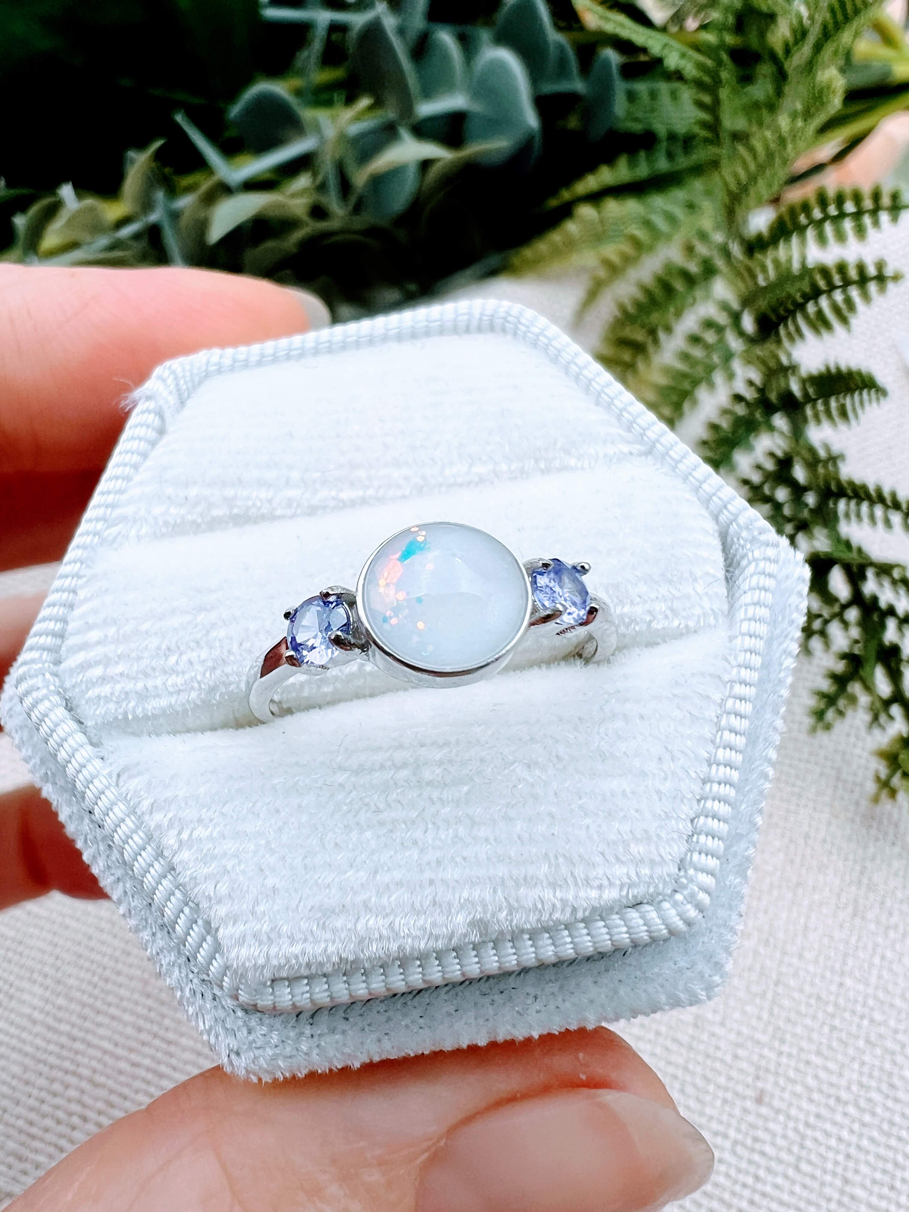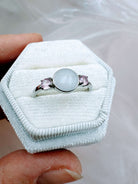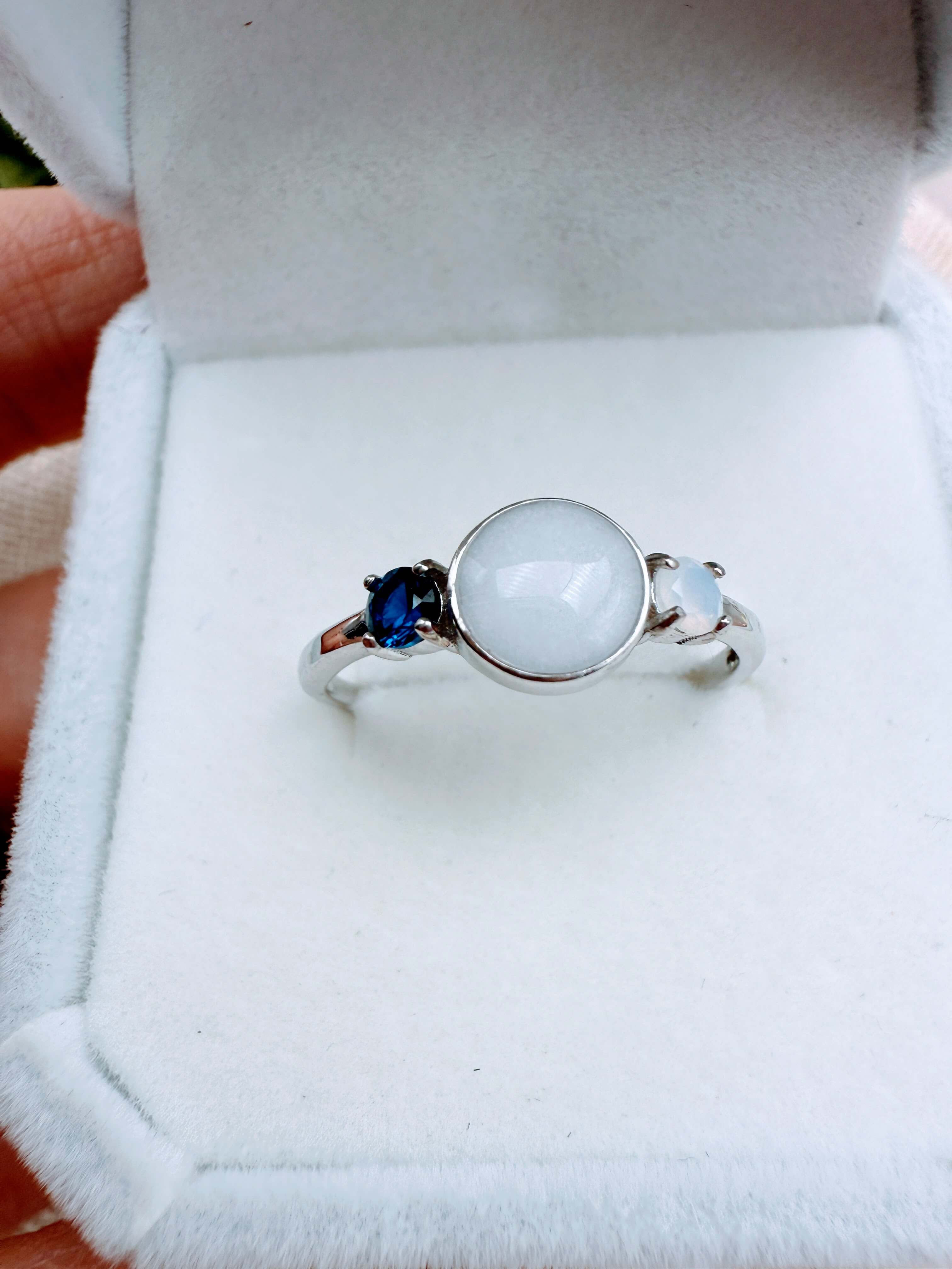 This is a stunning sterling silver ring with an 8mm breastmilk stone and two smaller cubic zirconia in the colour of your choice. Available in sterling silver with white, rose or yellow gold plating. Please add your stone colour choices and any other preferences in the comments box below.